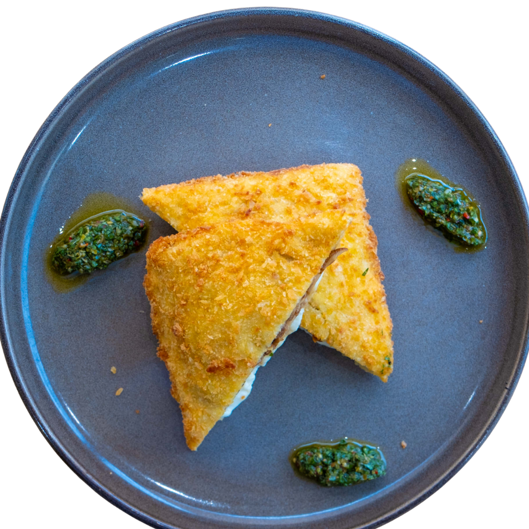 Mozzarella in carrozza e funghi porcini, con battuto di erbe fresche