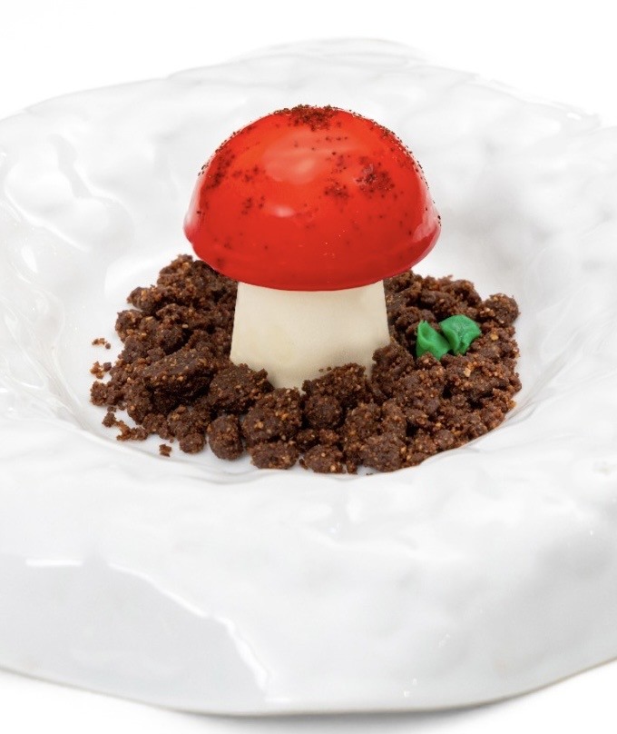 Fiodilatte di agerola, crema di zucca grigliata, funghi grigliati, chips di patate viola, blue di bufala, Basilico, Olio EVO “azienda agricola Badevisco”.