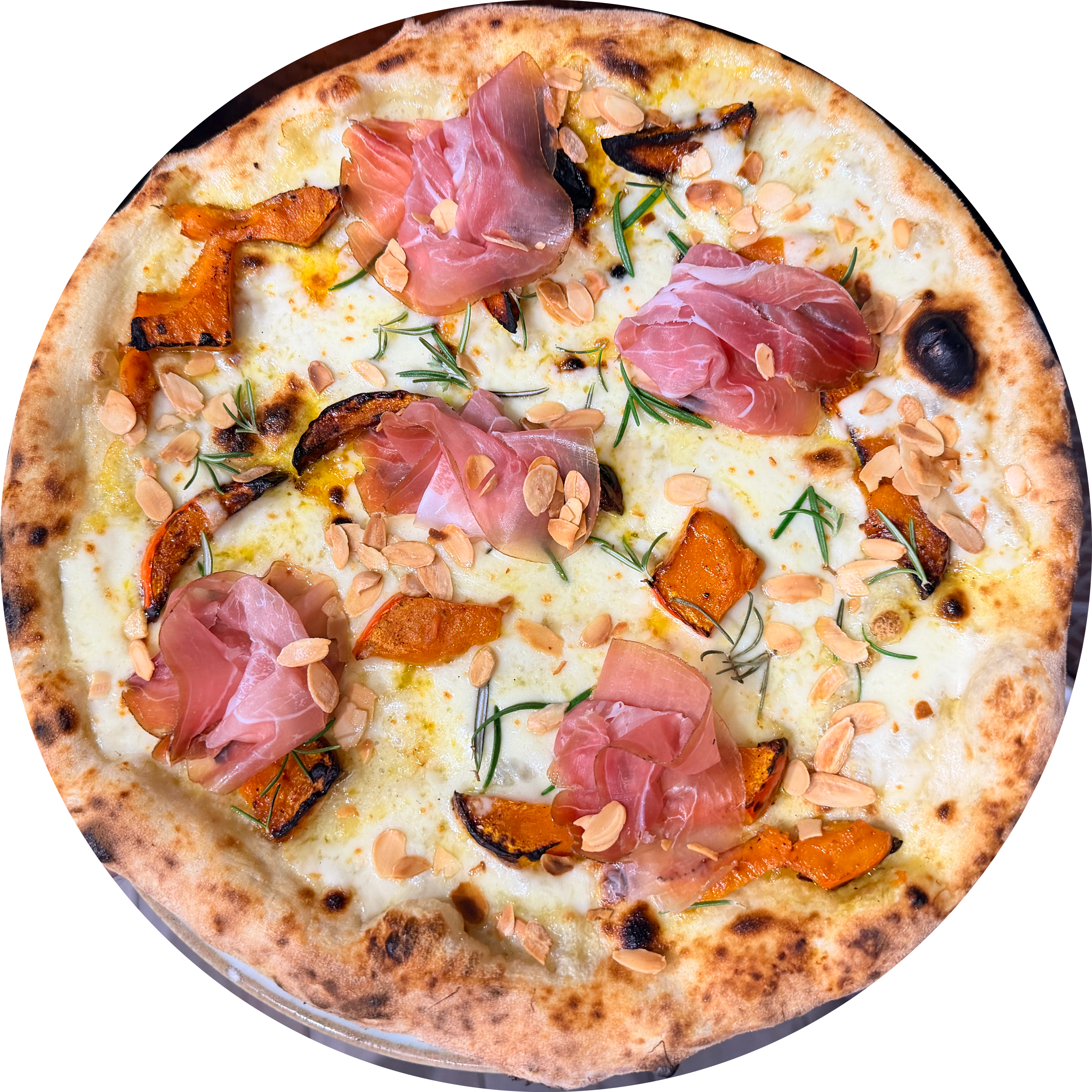 Fiordilatte di Agerola, zucca HOKKAIDO, speck Villani, fontina, lamelle di mandorle tostate, rosmarino e olio evo azienda agricola Badevisco.